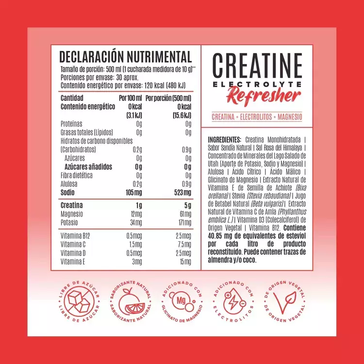 Creatine Electrolyte Refresher es la forma más refrescante y deliciosa de incorporar creatina a tu vida, combinando 5g de creatina monohidratada pura por porción con una mezcla exclusiva de electrolitos esenciales y glicinato de magnesio.