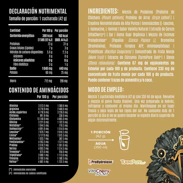 Cada porción aporta hasta 31 g de proteína vegetal, 3 g de creatina y 6 g de BCAAS, así como TurmiPure® (extracto de cúrcuma), VitaCherry Sport® (extracto de cereza) y Prohydrolase® (mezcla de enzimas).